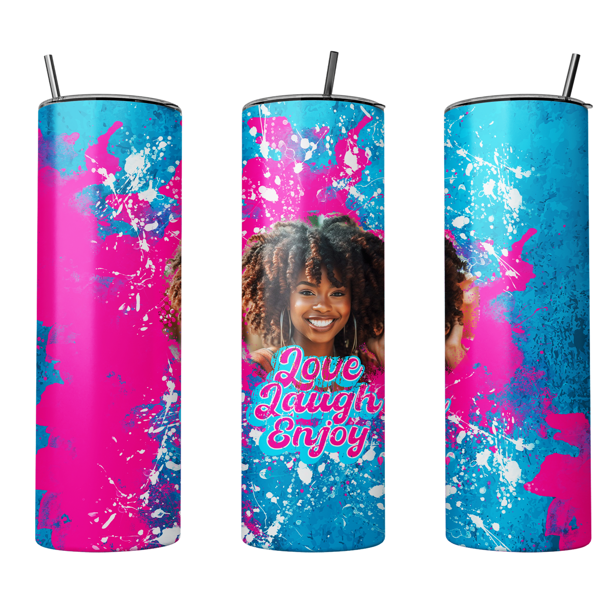 Serve your drinks in style with the Love, Laugh, Enjoy 20oz Tumbler! Boasting vibrant colors and a fashionable design, this premium drinkware keeps drinks hot and cold. Enjoy your favorite beverages with a touch of flair - Love, Laugh, Enjoy!